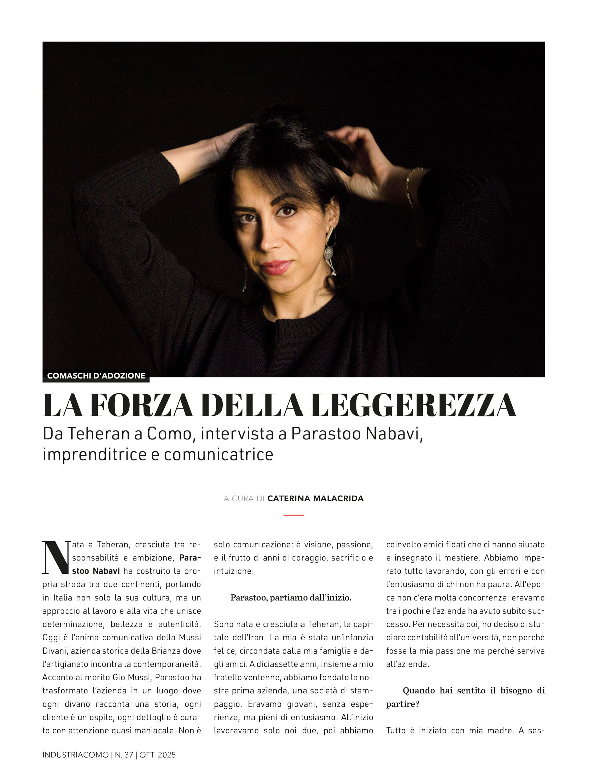 Nata a Teheran, cresciuta tra responsabilità e ambizione, Parastoo Nabavi ha costruito la propria strada tra due continenti, portando in Italia non solo la sua cultura, ma un approccio al lavoro e alla vita che unisce determinazione, bellezza e autenticità. Oggi è l’anima comunicativa della Mussi Divani, azienda storica della Brianza dove l’artigianato incontra la contemporaneità. Accanto al marito Gio Mussi, Parastoo ha trasformato l’azienda in un luogo dove ogni divano racconta una storia, ogni cliente è un ospite, ogni dettaglio è curato con attenzione quasi maniacale. Non è solo comunicazione: è visione, passione, e il frutto di anni di coraggio, sacrificio e intuizione.