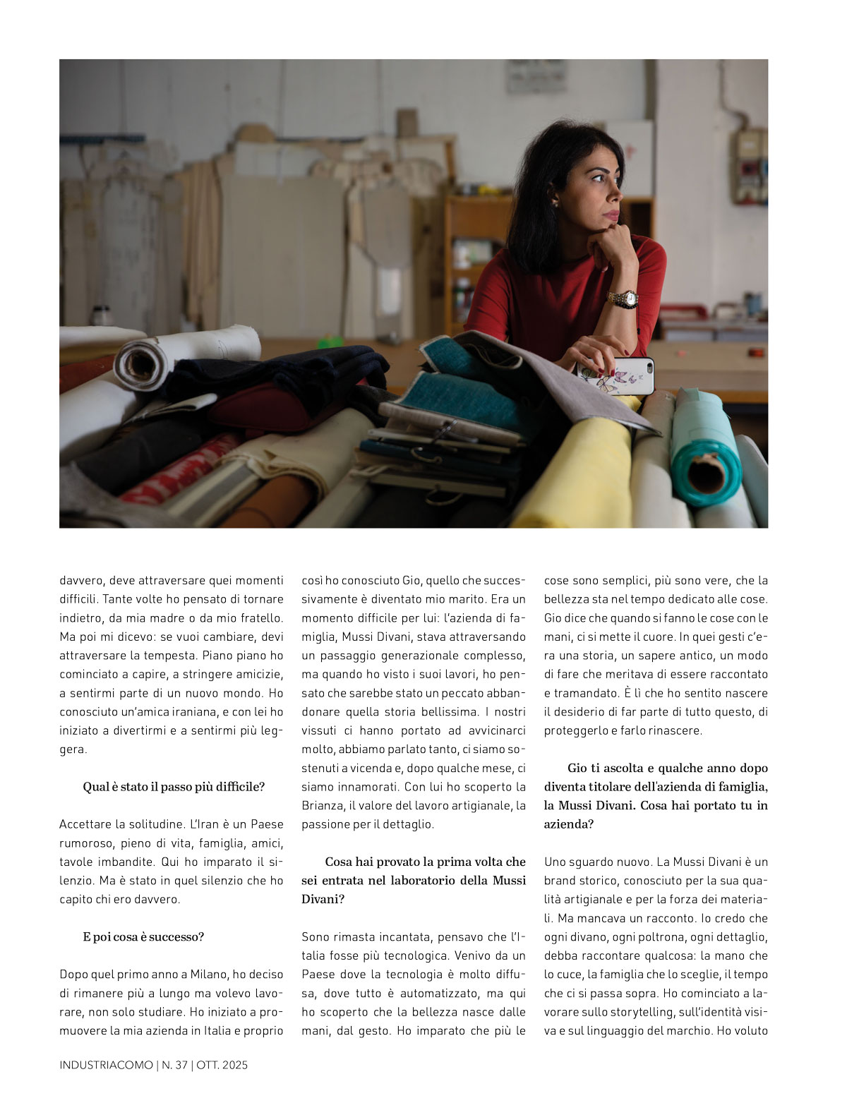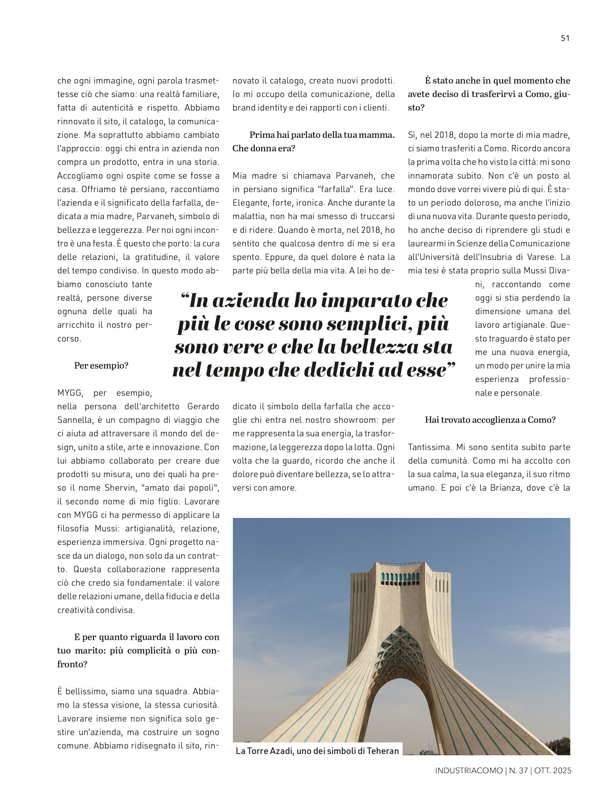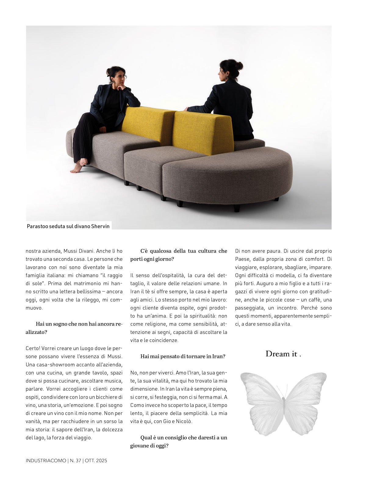 Uno sguardo nuovo. La Mussi Divani è un brand storico, conosciuto per la sua qualità artigianale e per la forza dei materiali. Ma mancava un racconto. Io credo che ogni divano, ogni poltrona, ogni dettaglio, debba raccontare qualcosa: la mano che lo cuce, la famiglia che lo sceglie, il tempo che ci si passa sopra. Ho cominciato a lavorare sullo storytelling, sull’identità visiva e sul linguaggio del marchio. Ho voluto che ogni immagine, ogni parola trasmettesse ciò che siamo: una realtà familiare, fatta di autenticità e rispetto. Abbiamo rinnovato il sito, il catalogo, la comunicazione. Ma soprattutto abbiamo cambiato l’approccio: oggi chi entra in azienda non compra un prodotto, entra in una storia. Accogliamo ogni ospite come se fosse a casa. Offriamo tè persiano, raccontiamo l’azienda e il significato della farfalla, dedicata a mia madre, Parvaneh, simbolo di bellezza e leggerezza. Per noi ogni incontro è una festa. È questo che porto: la cura delle relazioni, la gratitudine, il valore del tempo condiviso. In questo modo abbiamo conosciuto tante realtà, persone diverse ognuna delle quali ha arricchito il nostro percorso.